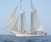 There's a fleet of these coasting schooners, as they're called, up in Maine, and Doug and Linda Lee like to sail at every opportunity. Watching them handle the ship as they ghost along under the Deer Isle Bridge spanning Eggemoggin Reach is fascinating. The ship's mast, jutting 102 feet up, is higher than the bridge's superstructure, and to pass underneath requires lowering the ship's topmast a few feet. That mast is on a track built especially for the purpose, and seeing the crew scamper up the ratlines to let the topmast down is quite a show. It looks like you're going to hit the bridge, but there's just room to slide along beneath and go on to other sailing grounds in Blue Hill Bay, Fox Thoroughfare and other old waters that have been home to sailors and lobstermen for years.